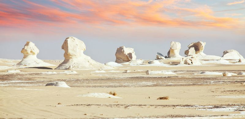 Se considera uno de los fascinantes lugares donde puedes disfrutar de formaciones de rocas de calcio. El desierto blanco ocupa un área de superficie de casi 3 mil km y Se volvió una zona protegida desde el año 2002. En los tiempos anteriores este desierto era cubierto con el mar y la tiza blanca que forma todas estas piedras. En el camino que relacione fárafra con Bahriya puedes encontrar algunas rocas con forma de animales, setas y algunas rocas con formas raras.