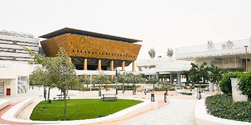 Central Plaza, custodiada por la Agencia Espacial de EAU, ofrece refugio bajo sus materiales claros y asientos que desafían el calor. Su hermana, Eco Plaza, cobija a visitantes bajo sombras generosas, mientras una fuente susurra serenidad.