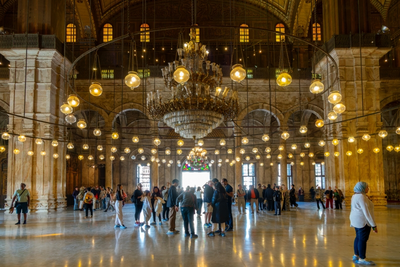 Al entrar en la Mezquita de Alabastro, lo primero que sientes es la amplitud y la calma. El suelo cubierto de alfombras rojas, los detalles dorados, los candelabros colgantes y el suave brillo del alabastro crean un ambiente espiritual único.