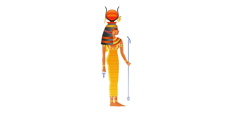 Diosa del amor, la belleza y la música, Hathor era representada frecuentemente como una vaca, simbolizando la nutrición y la fertilidad. Su culto estaba muy extendido y sus templos eran centros de música y alegría.
