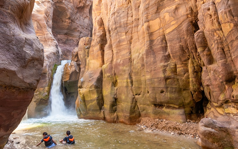 Las cascadas de Mujib son una serie de cascadas que se encuentran en el interior del cañón. Se puede llegar a ellas a través de un sendero de senderismo que conduce a una piscina natural donde se puede nadar.