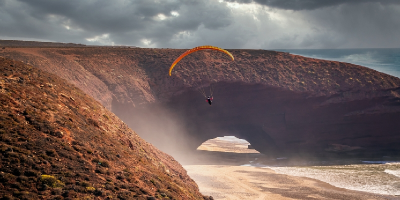 El encuentro entre el aliento cálido del Sáhara y las húmedas corrientes oceánicas teje un microclima único. La niebla costera emerge como un velo místico, añadiendo misterio al paisaje en lugar de ocultarlo. Esta danza atmosférica, junto al eterno oleaje atlántico, ha convertido Legzira en un paraíso para los parapentistas, quienes surcan los cielos desde las montañas cercanas hasta posarse suavemente en la arena.