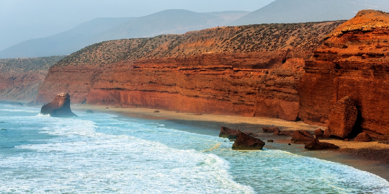 La característica más destacada de la playa de Legzira es sus enormes arcos rocosos naturales de color rojizo que se extienden sobre la arena y el mar, ofreciendo un paisaje único y espectacular, especialmente al atardecer.